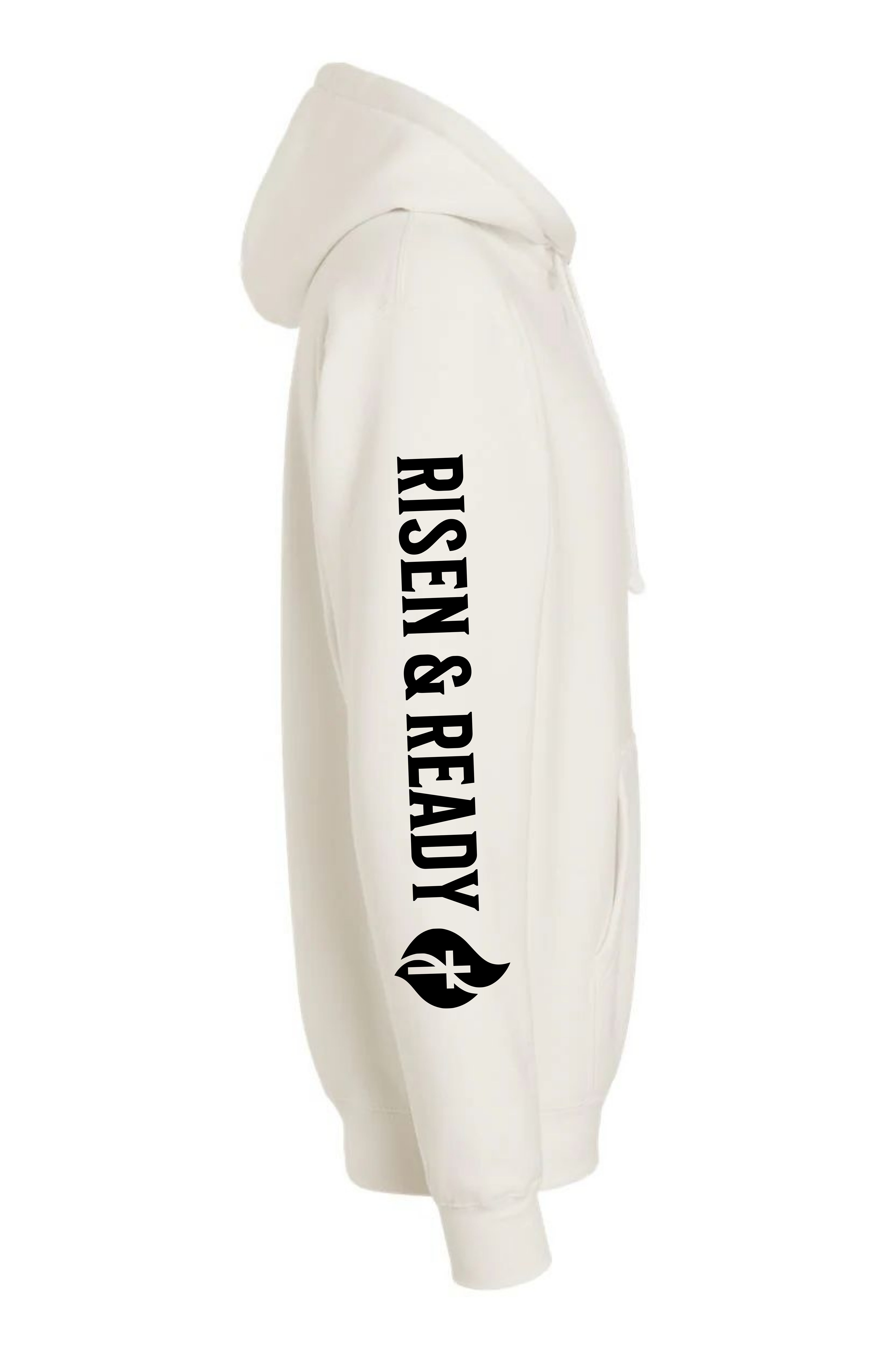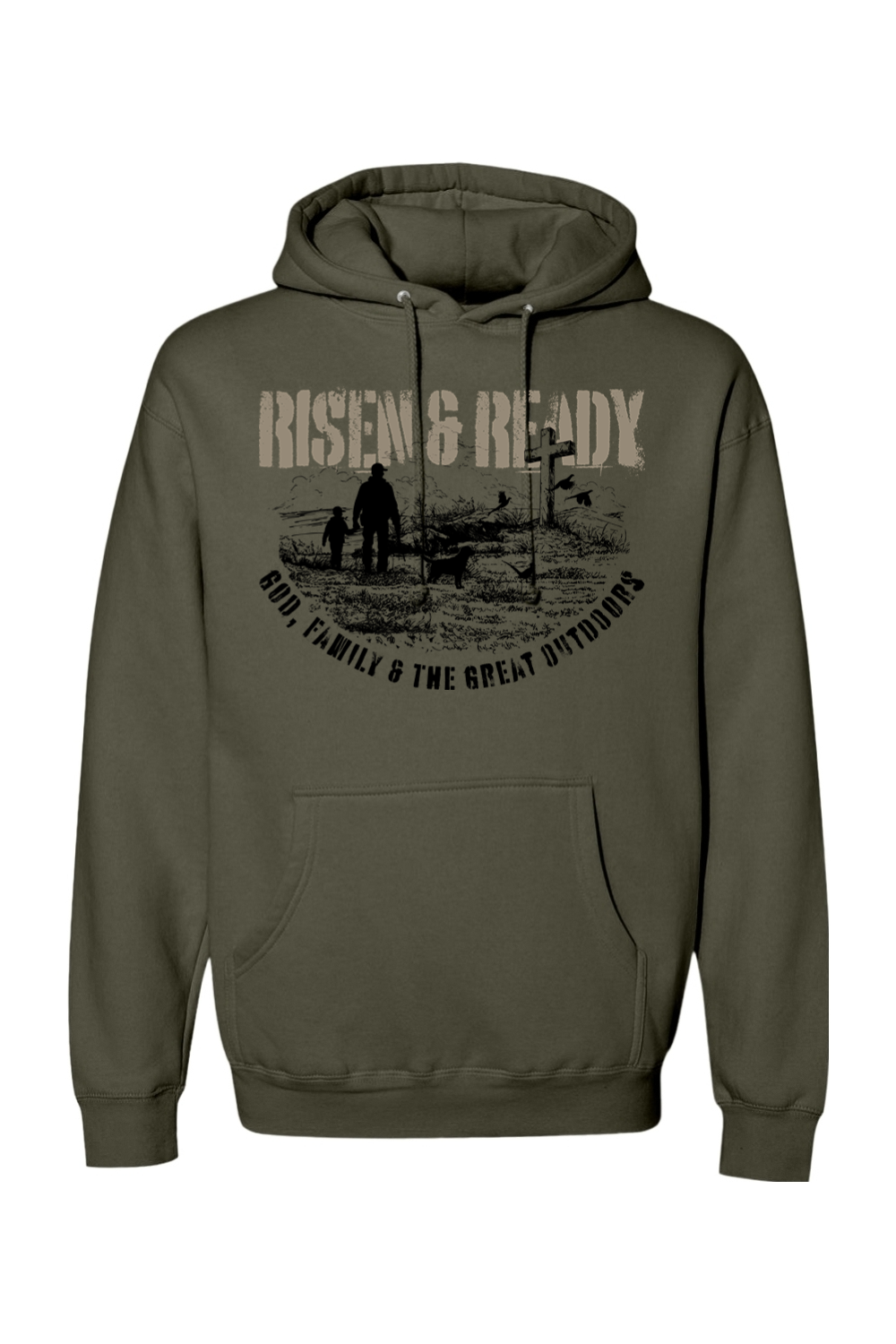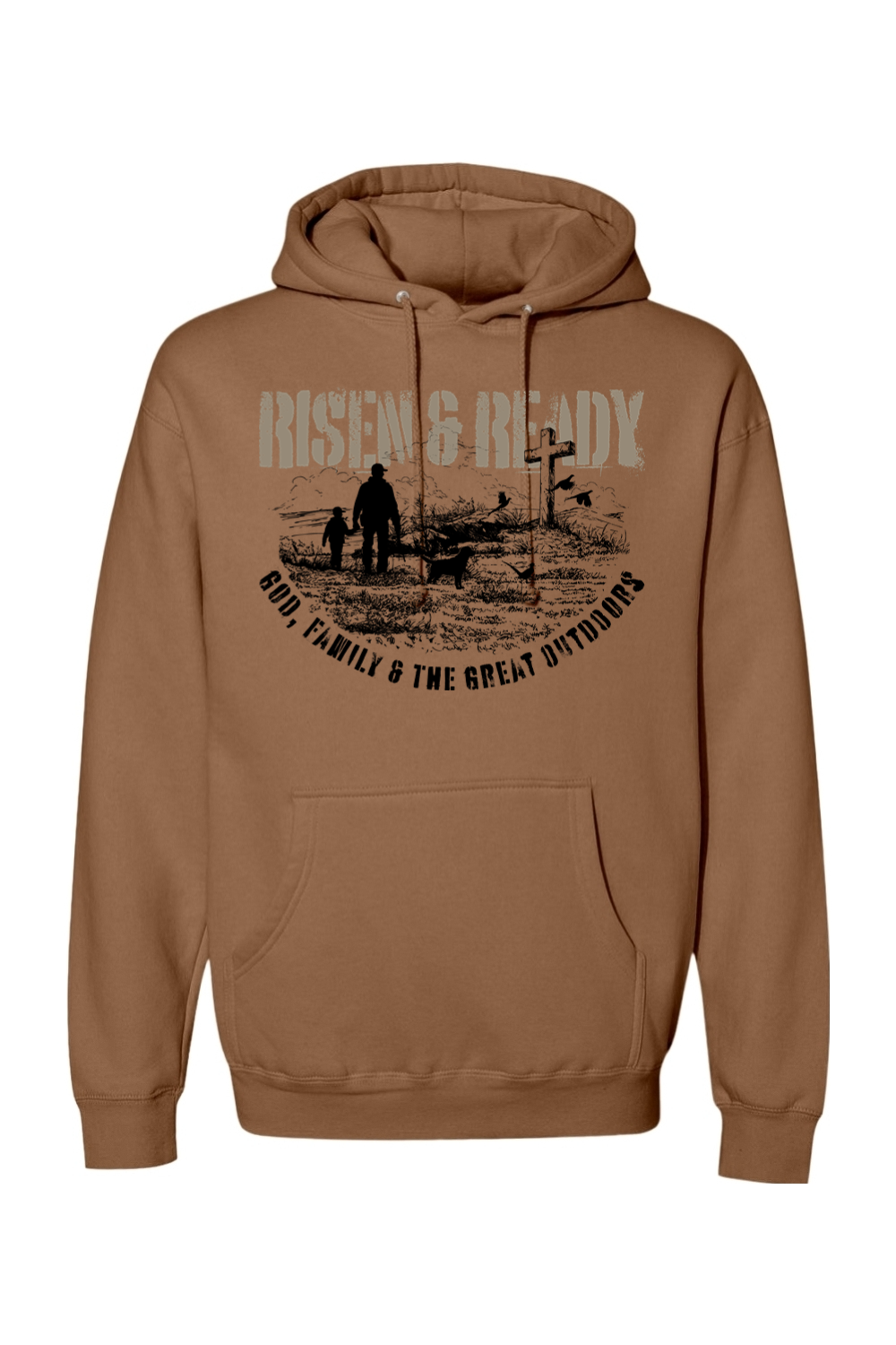 The God, Family, Outdoors Foundation Hoodie represents the values we live by and the mission we stand on. Designed with a bold distressed Risen & Ready graphic and cross on the hill, this shirt is a statement of priorities—faith first, family always, and strength built in the outdoors.
