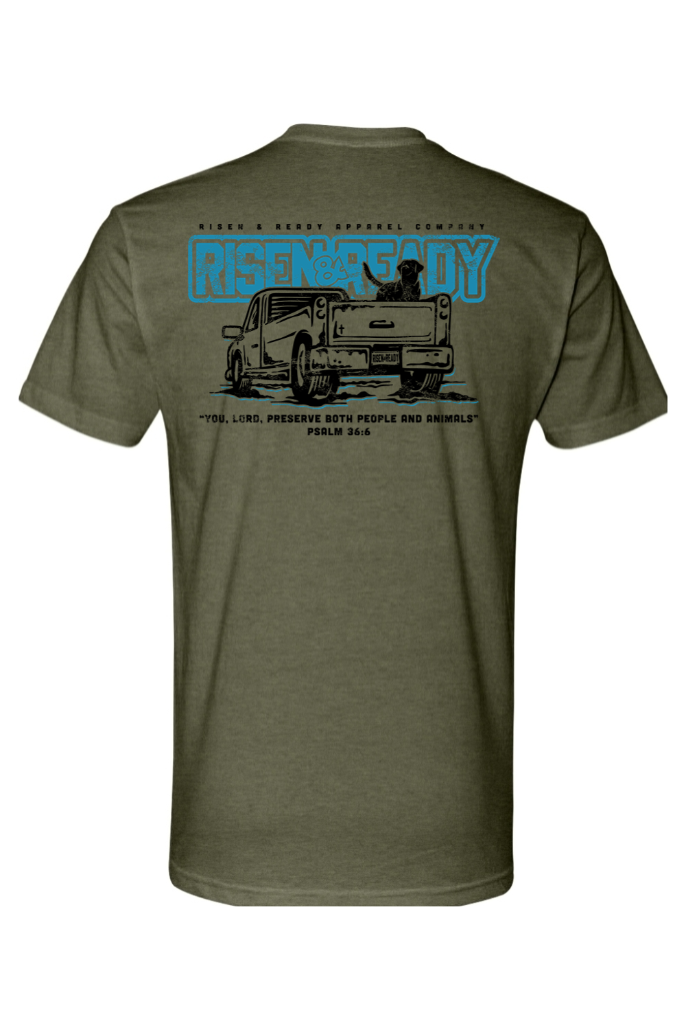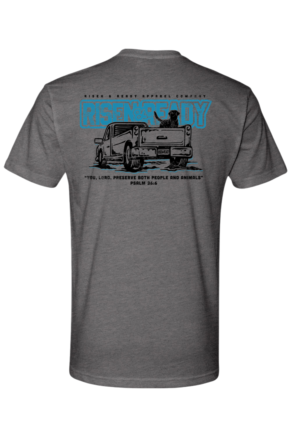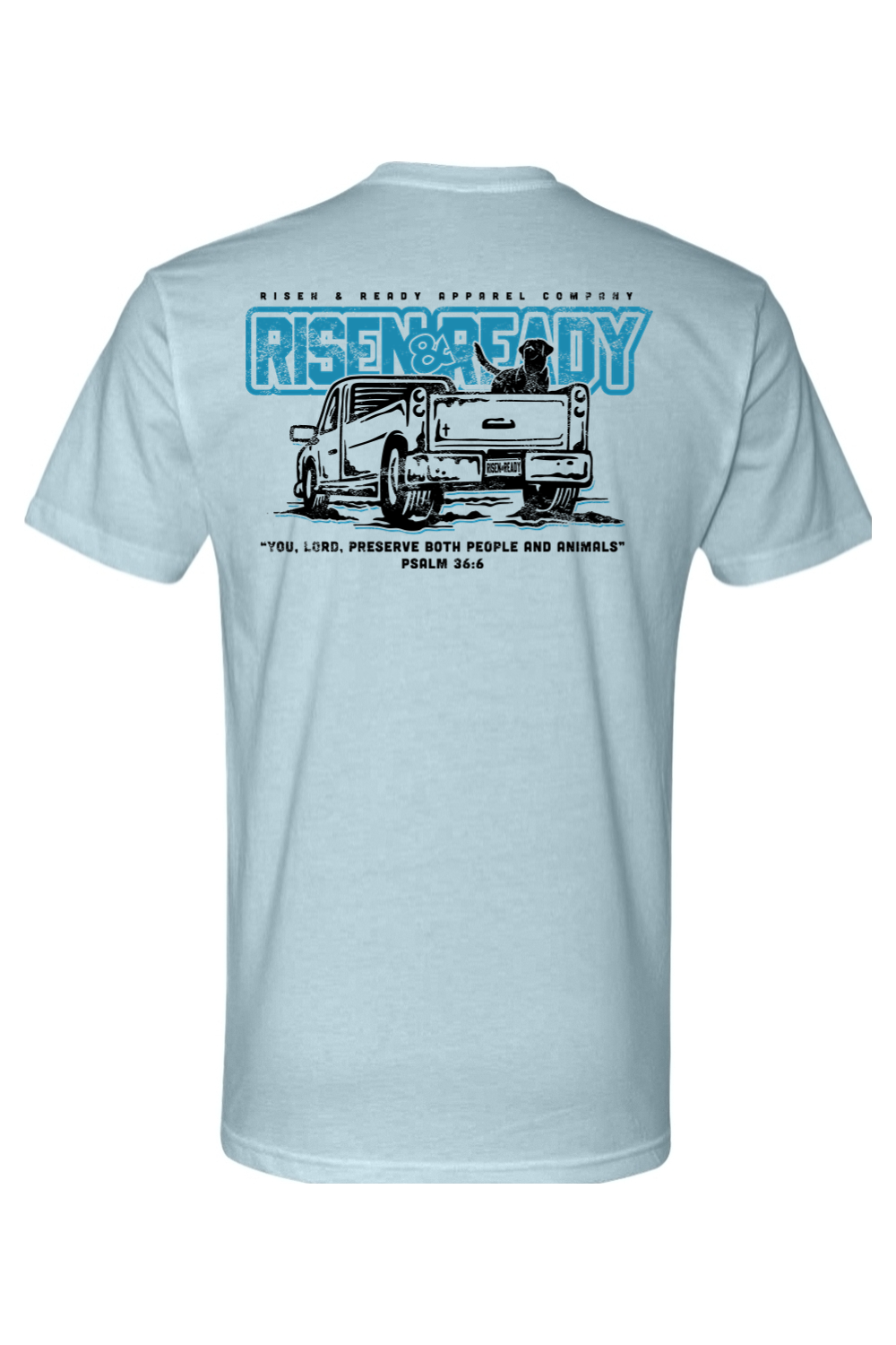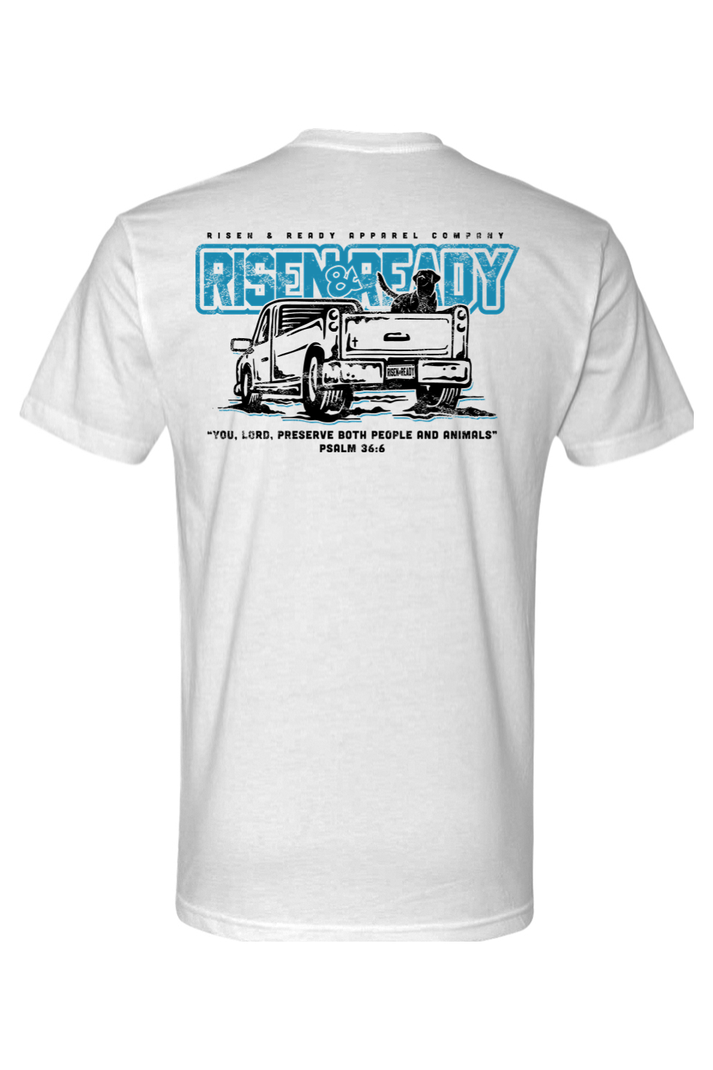 Featuring bold Risen & Ready artwork with a classic pickup scene and Psalm 36:6, this tee reminds us that the Lord watches over both people and animals.