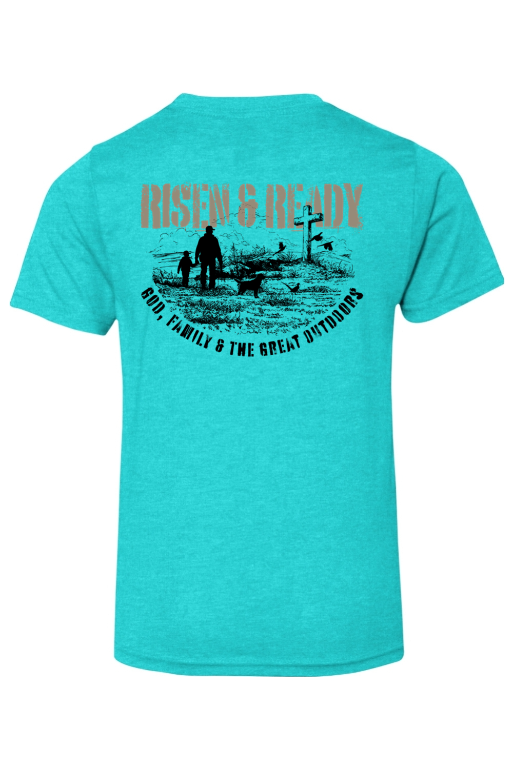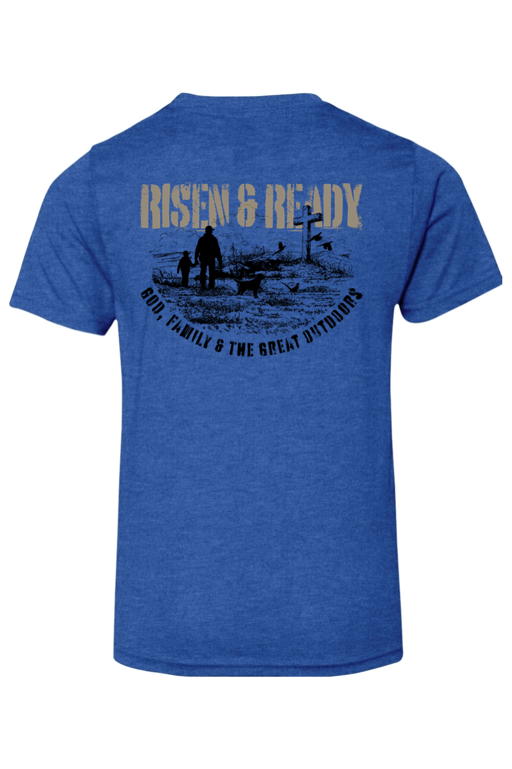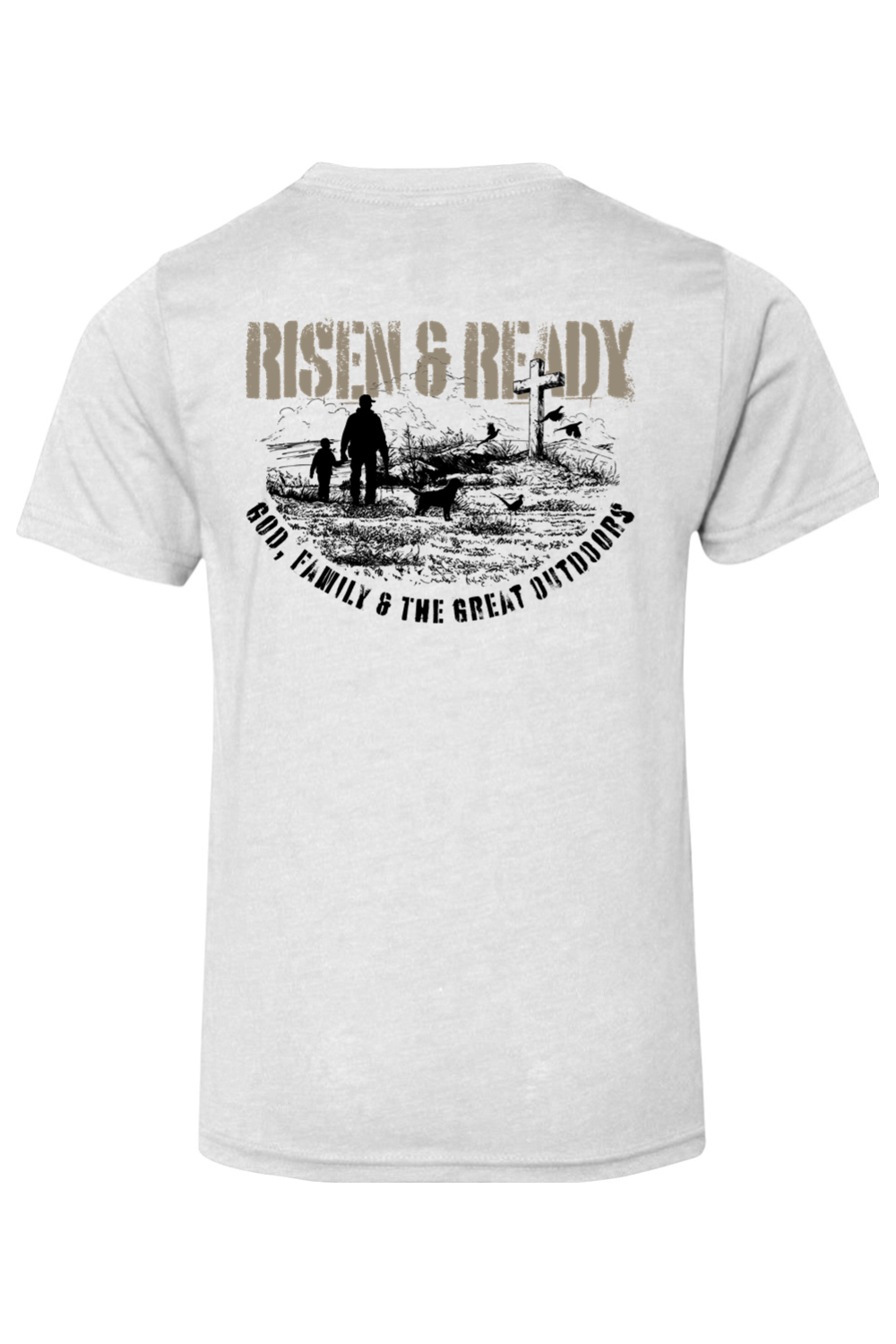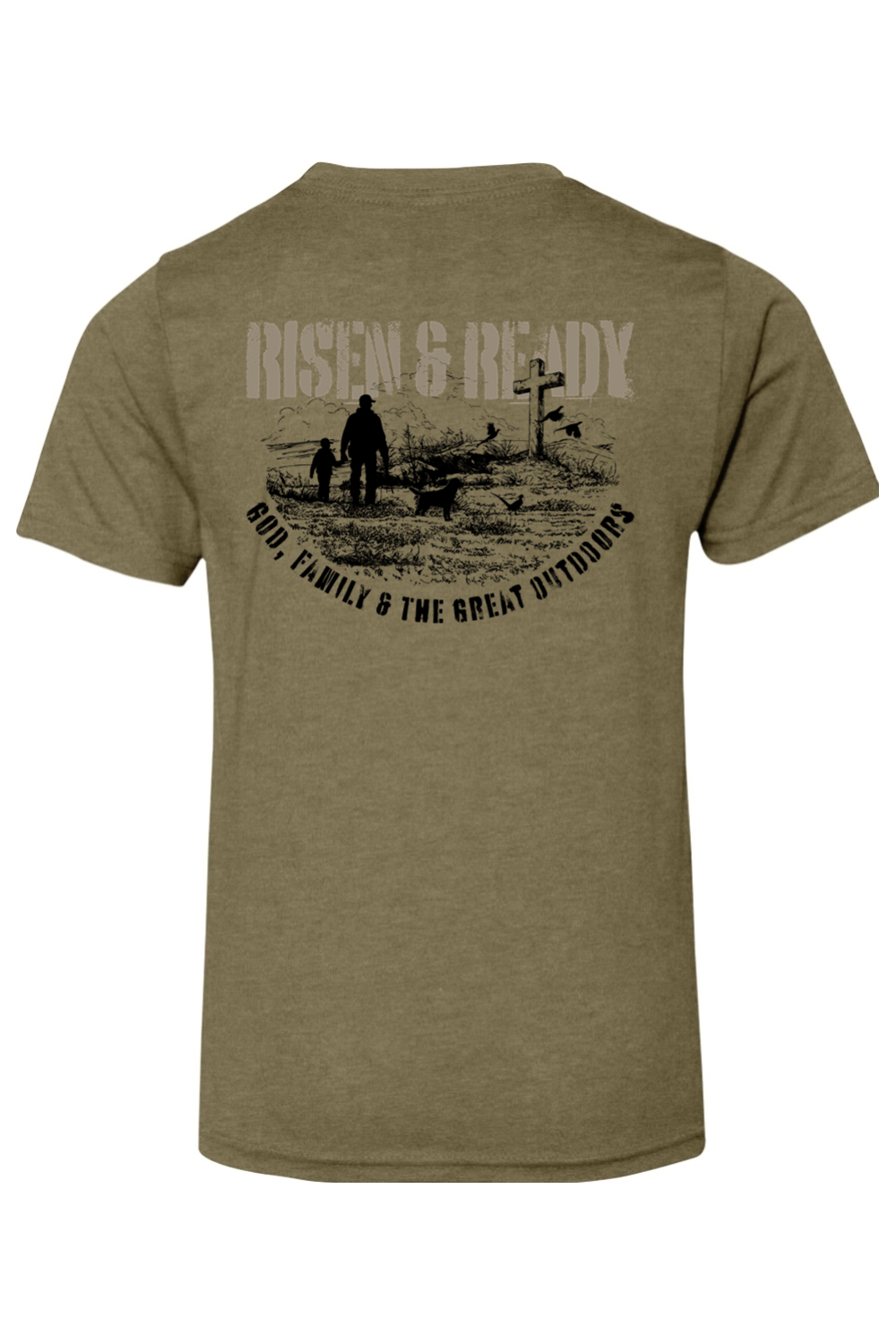 The God, Family, Outdoors Foundation Tee represents the values we live by and the mission we stand on. Designed with a bold distressed Risen & Ready graphic and cross on the hill, this shirt is a statement of priorities—faith first, family always, and strength built in the outdoors.