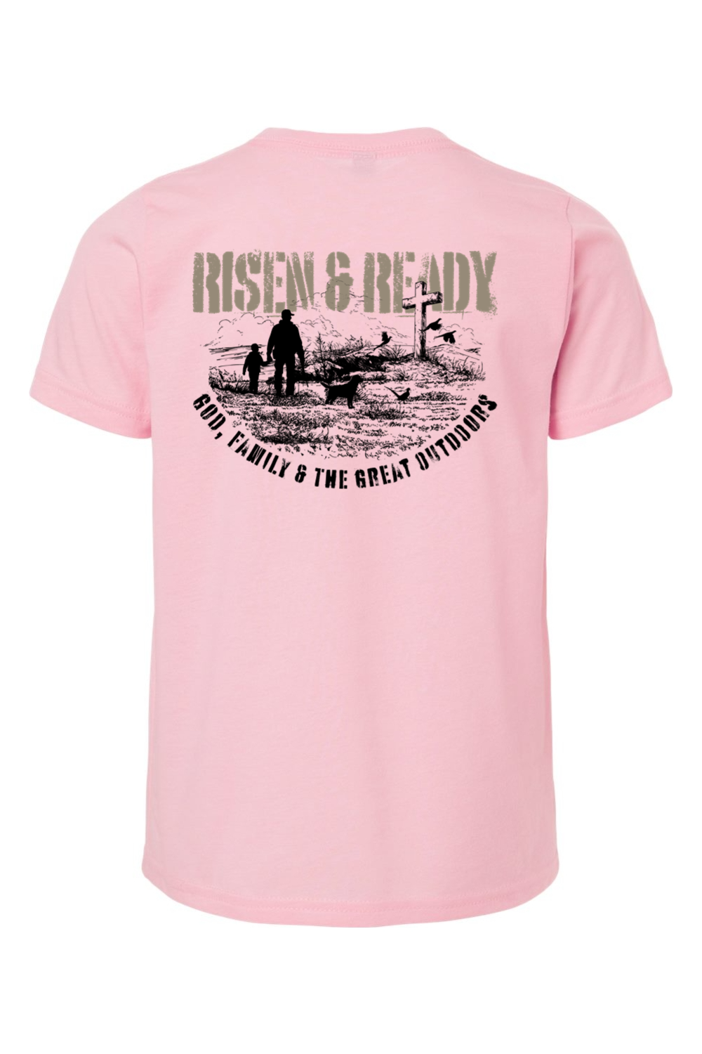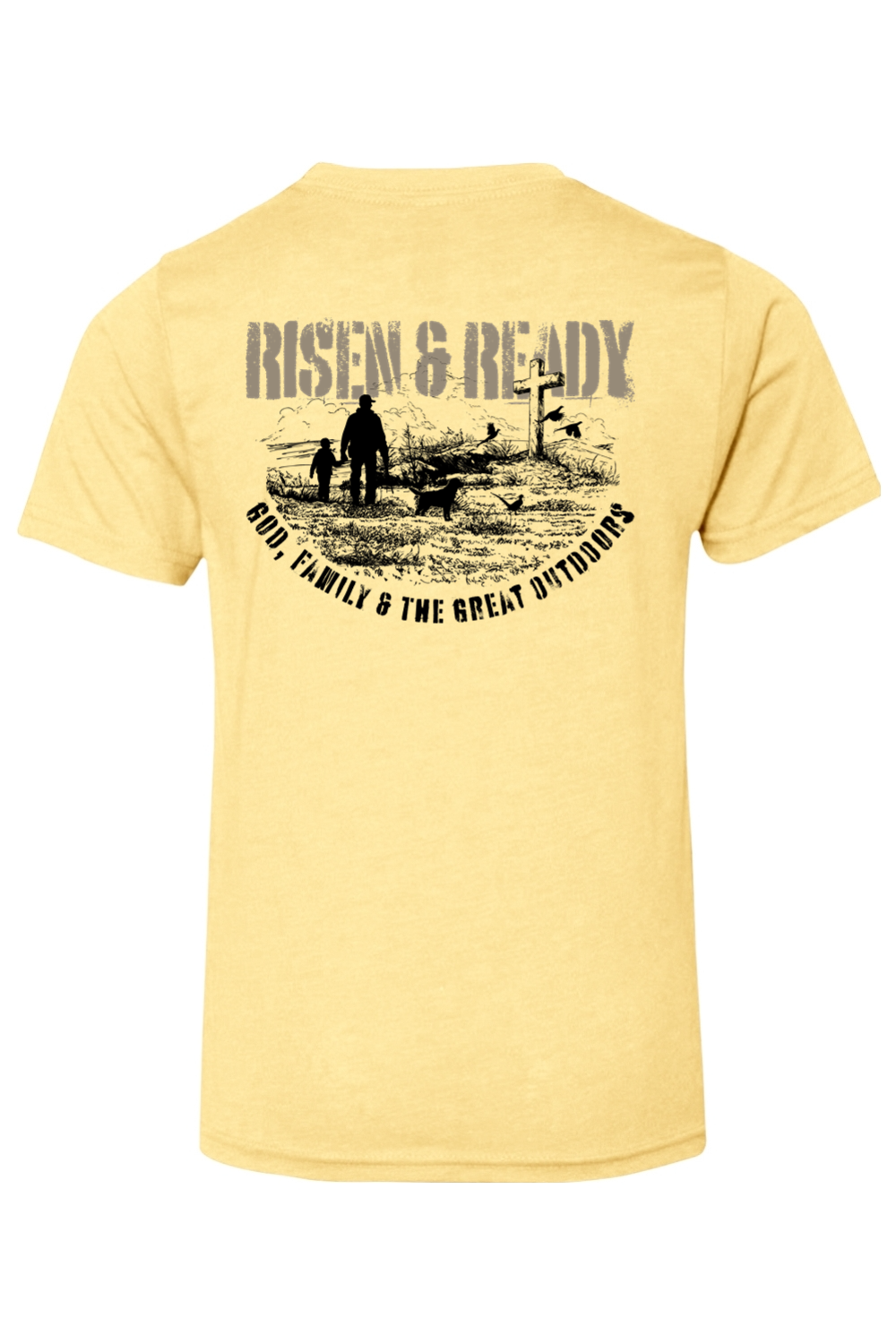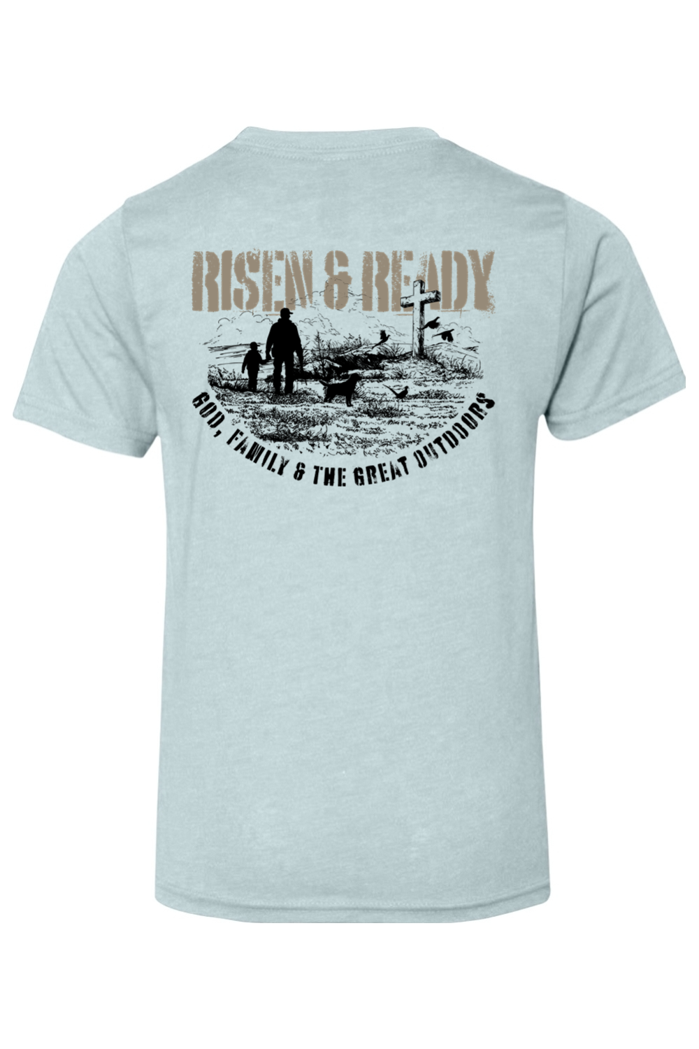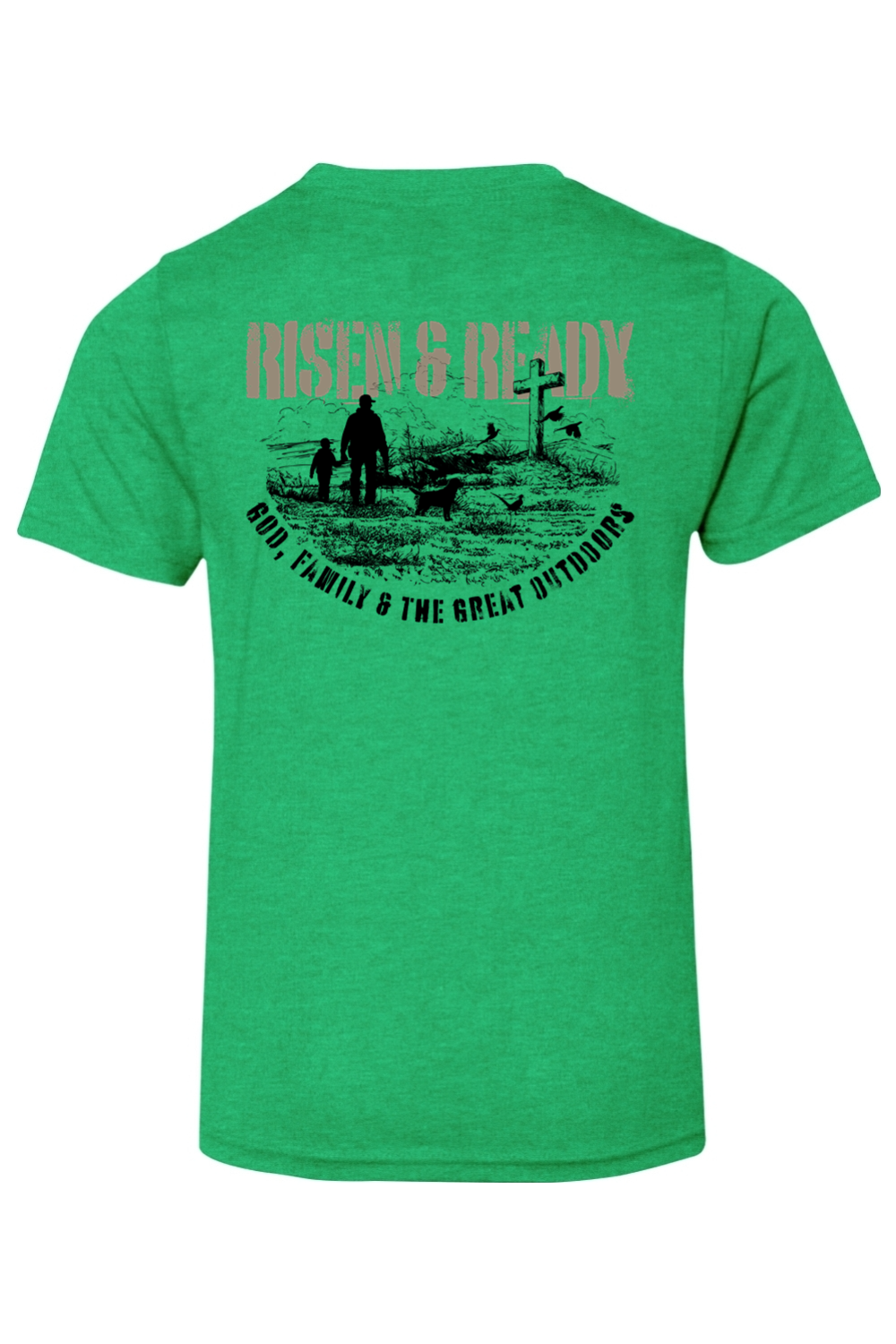 The God, Family, Outdoors Foundation Tee represents the values we live by and the mission we stand on. Designed with a bold distressed Risen & Ready graphic and cross on the hill, this shirt is a statement of priorities—faith first, family always, and strength built in the outdoors.