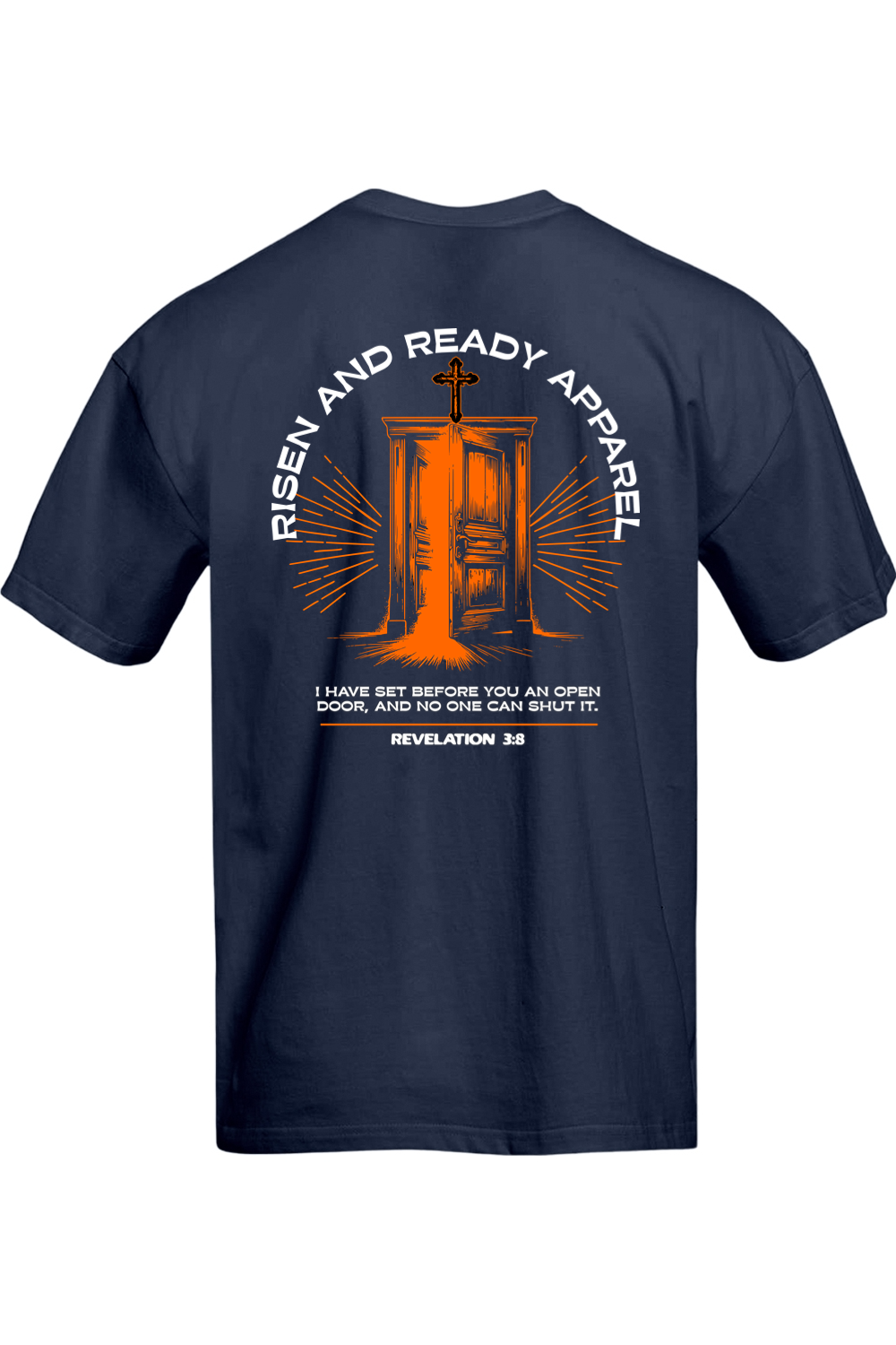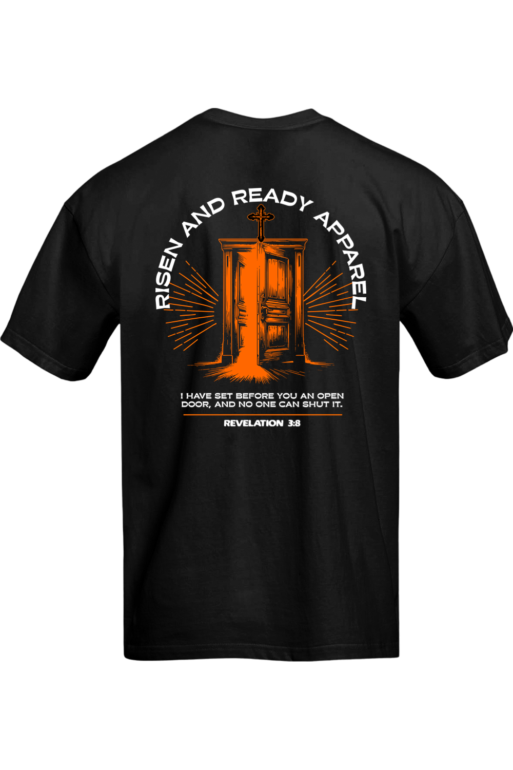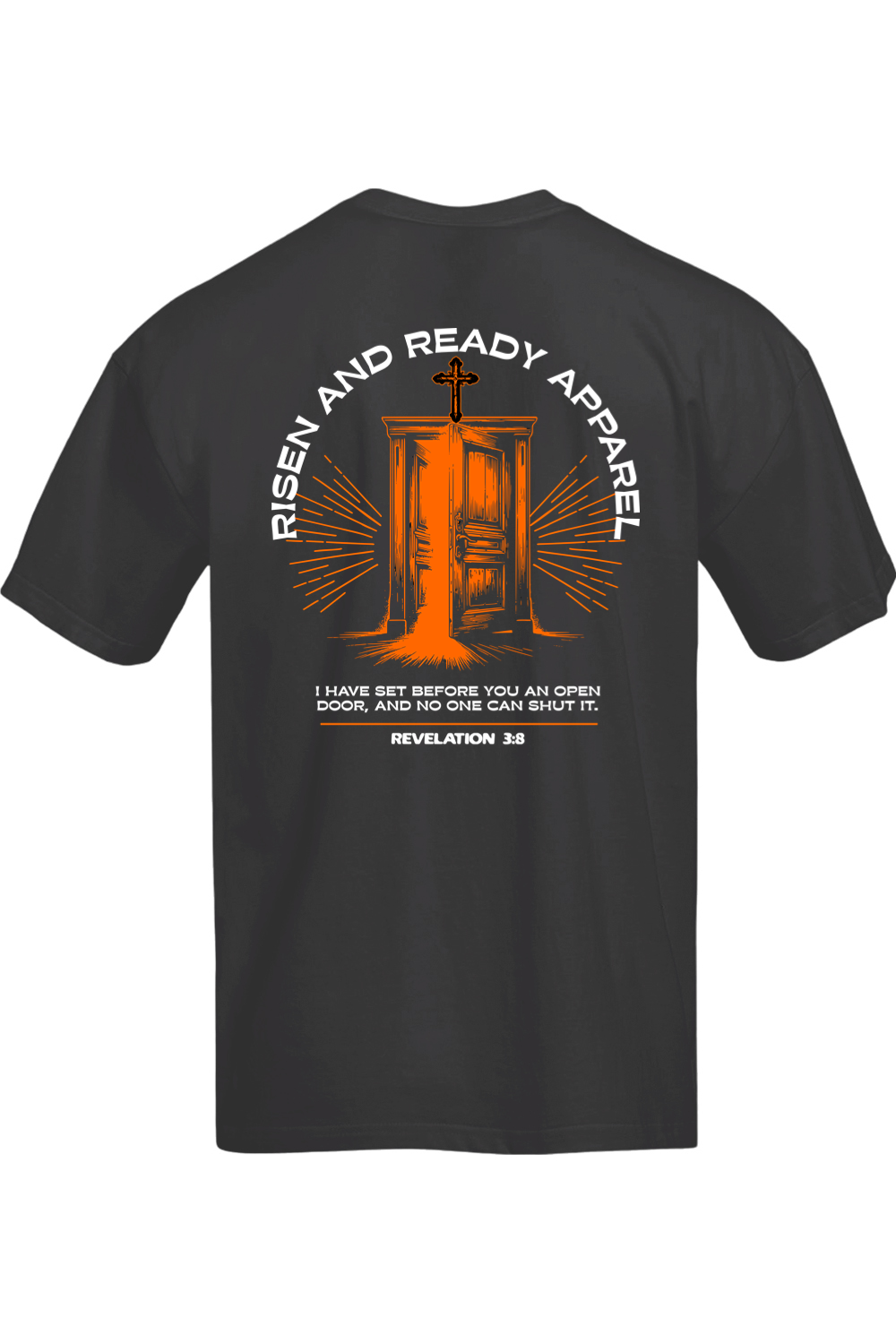 Embrace your purpose confidently with the Open Door Oversized Tee, inspired by Revelation 3:8: “I have set before you an open door, and no one can shut it.” Featuring a subtle shield crest with the Risen & Ready flame logo on the front and a striking door graphic with radiant beams and scripture on the back, this tee serves as a powerful reminder of God’s unwavering promises.