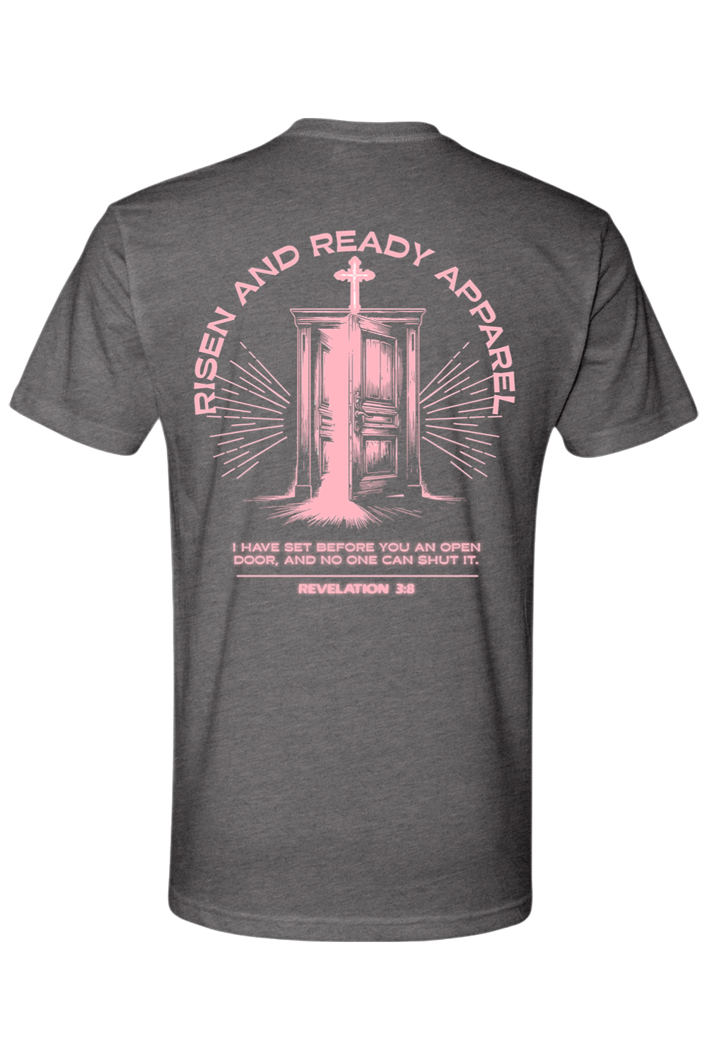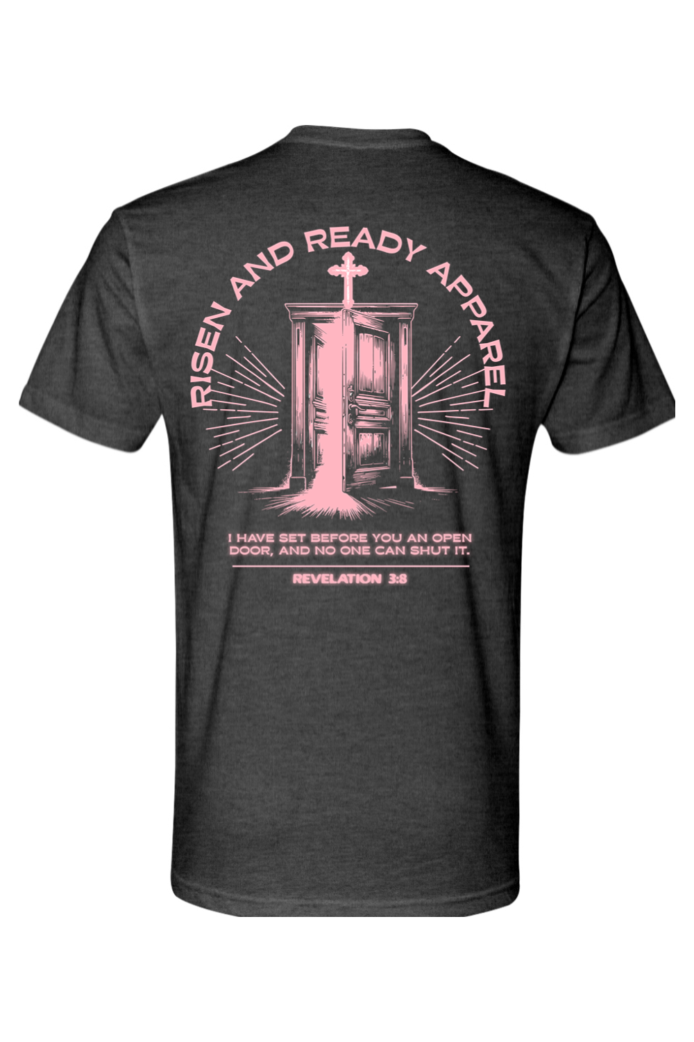 Embrace your purpose confidently with the Open Door Foundation Tee, inspired by Revelation 3:8: “I have set before you an open door, and no one can shut it.” Featuring a subtle shield crest with the Risen & Ready flame logo on the front and a striking door graphic with radiant beams and scripture on the back, this tee serves as a powerful reminder of God’s unwavering promises.