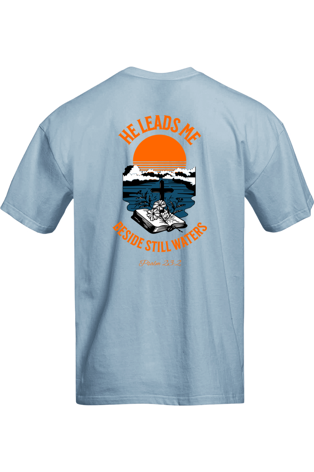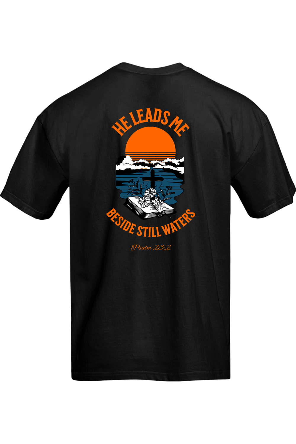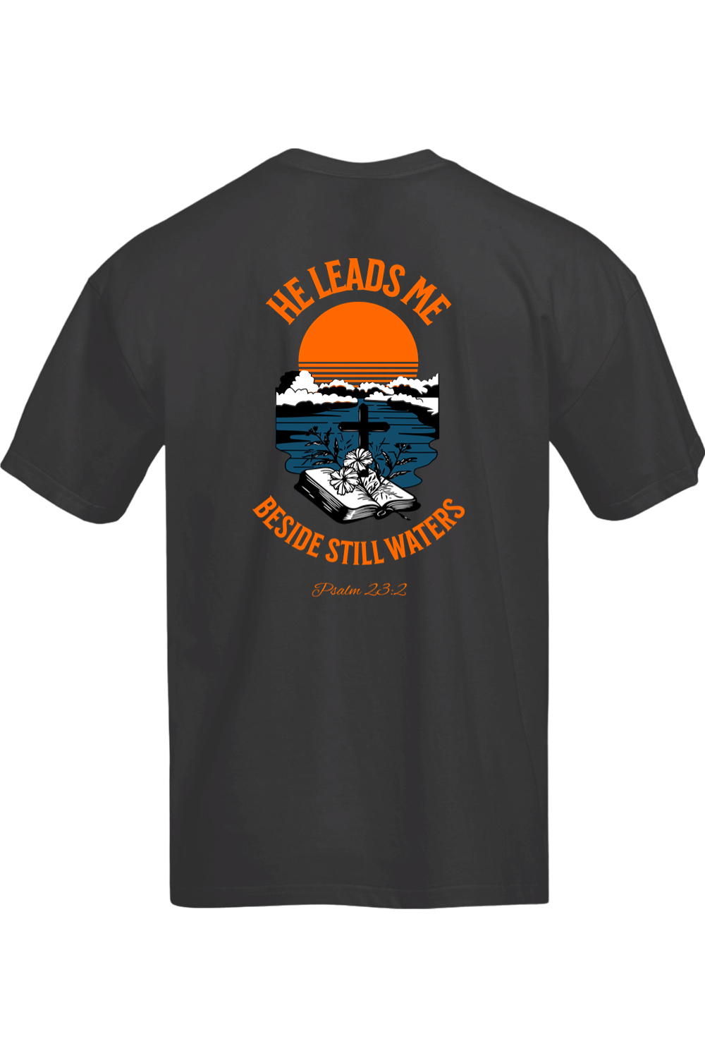 The Still Waters Oversized Tee is a reminder of God’s peace and guidance in every season. Featuring a striking sunset design with an open Bible and cross over calm waters, this shirt captures the promise of rest, renewal, and direction found in Psalm 23:2.