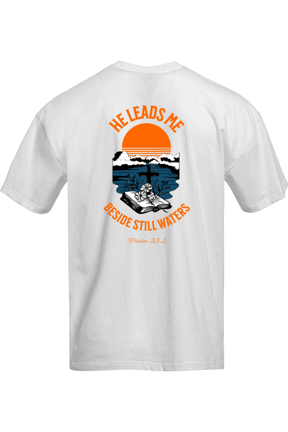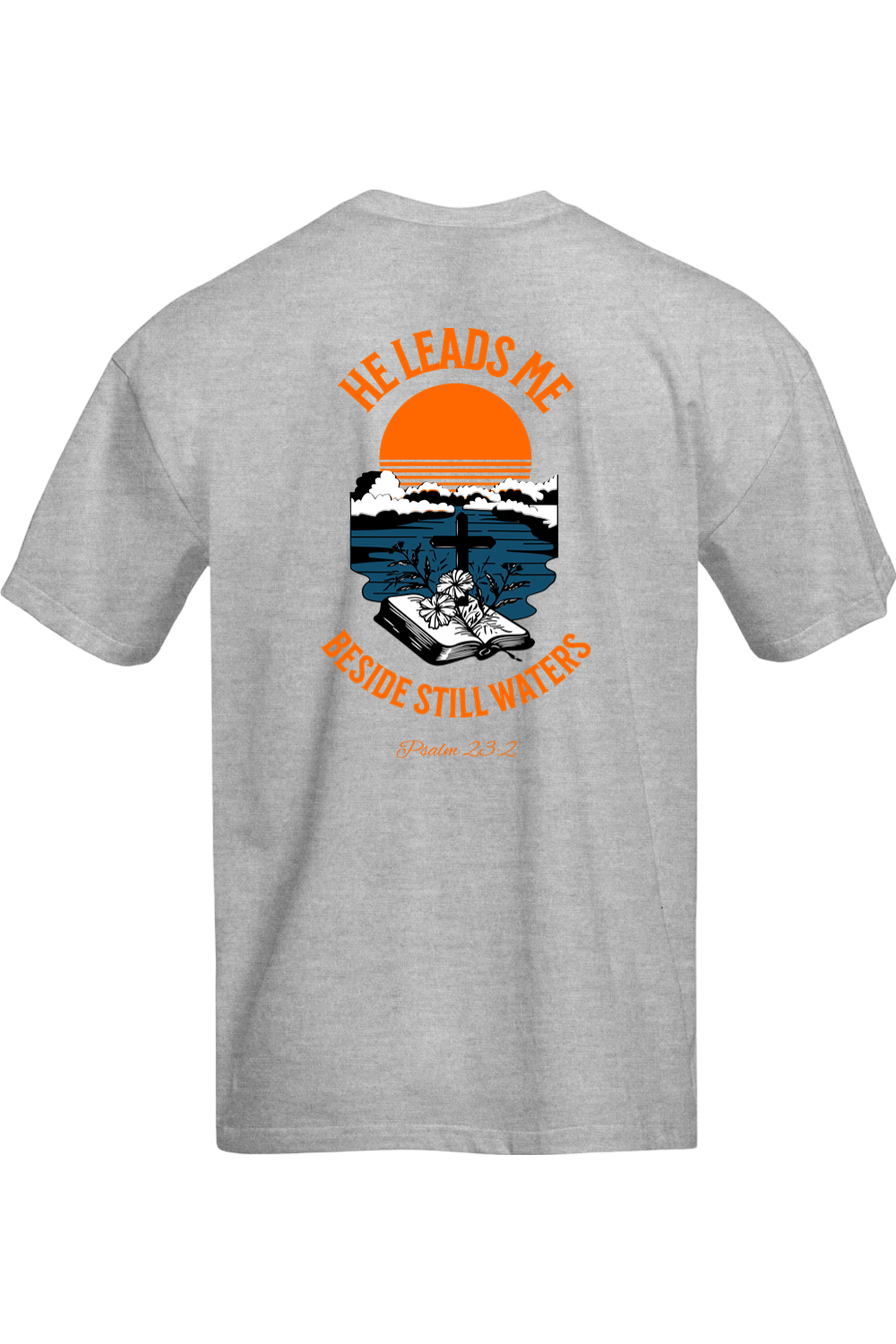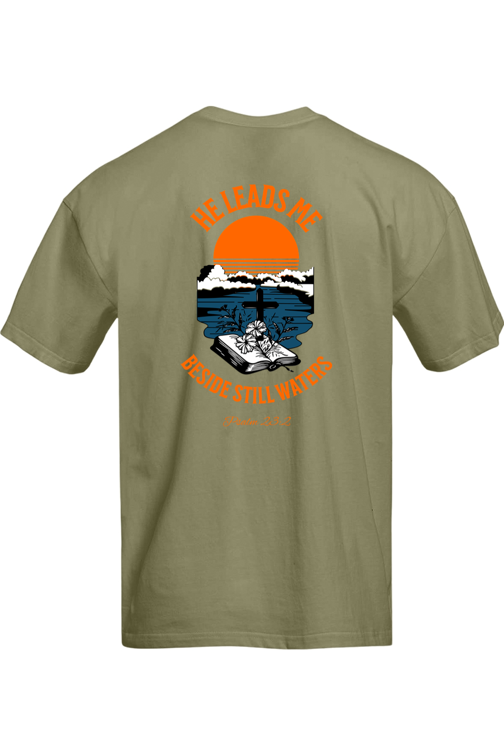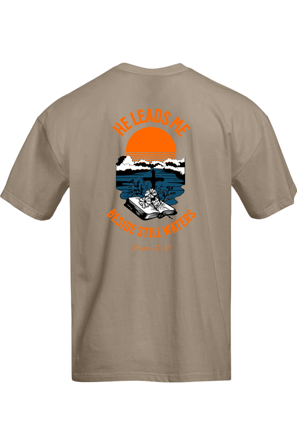 The Still Waters Oversized Tee is a reminder of God’s peace and guidance in every season. Featuring a striking sunset design with an open Bible and cross over calm waters, this shirt captures the promise of rest, renewal, and direction found in Psalm 23:2.